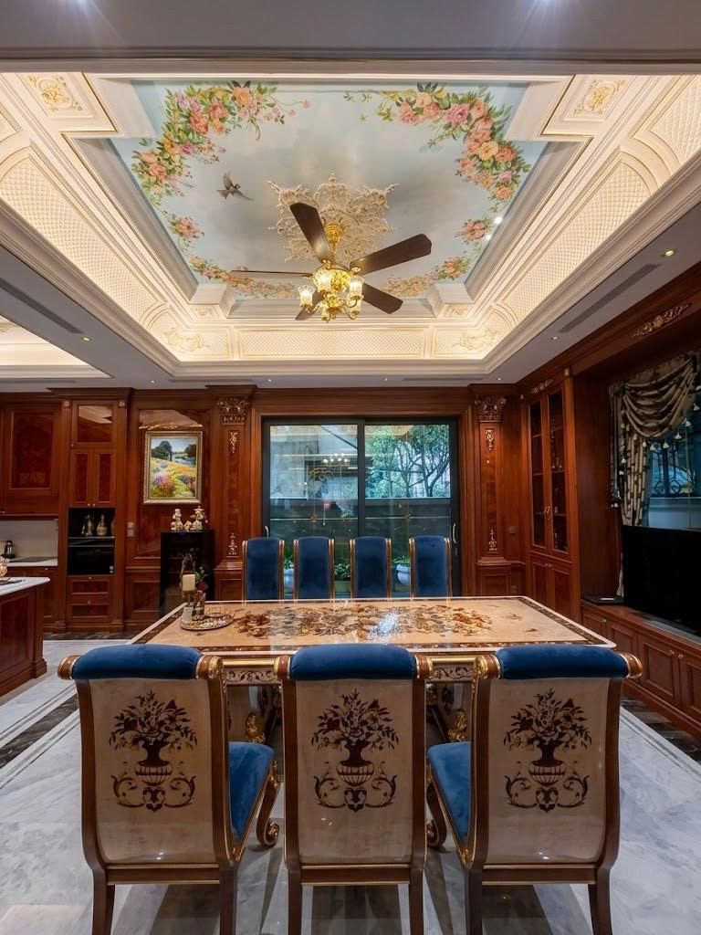 ✨ Biệt thự lộng lẫy với không gian nội thất toát lên vẻ sang trọng cổ điển đầy quyền quý, nơi từng chi tiết đều được chăm chút tinh xảo và hài hòa. Trần nhà được trang trí bằng tranh vẽ nghệ thuật phong cách châu Âu, kết hợp phào chỉ mạ vàng mềm mại, tạo cảm giác cao rộng và tráng lệ. Trung tâm là đèn chùm pha lê cổ điển ánh vàng ấm, tỏa sáng lung linh như điểm nhấn hoàng gia, vừa đủ rực rỡ nhưng không phô trương.