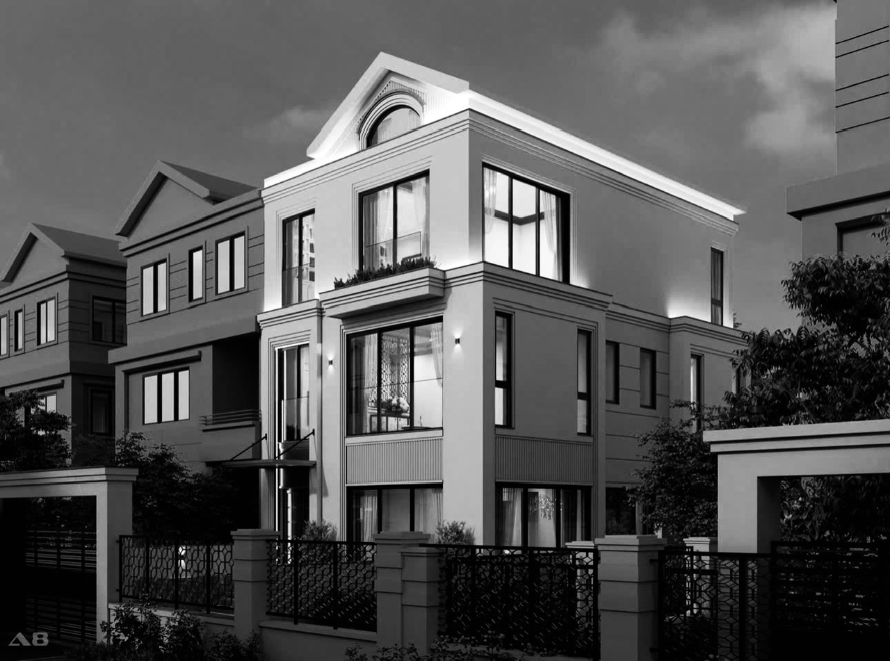 Biệt thự mang vẻ đẹp thanh lịch và hiện đại, với những đường nét tối giản nhưng tinh tế. Mảng kính lớn mở ra không gian thoáng đãng, khiến ánh sáng bên trong như hòa vào cảnh quan bên ngoài.