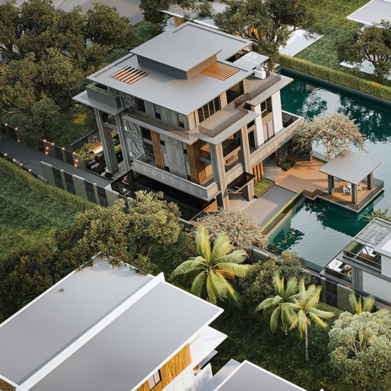Biệt thự được tổ chức trong tổng thể kiến trúc – cảnh quan hài hòa với thiên nhiên, nơi khối nhà hiện đại mạnh mẽ được đặt giữa không gian sân vườn xanh mát và hồ nước uốn lượn như một dòng chảy mềm mại. Hồ cá đóng vai trò trung tâm cảnh quan, phản chiếu kiến trúc và cây xanh xung quanh, tạo nên cảm giác thư thái, tĩnh tại và giàu tính nghỉ dưỡng. Các lối dạo, chòi nghỉ và mảng cây nhiệt đới được bố trí có chủ đích, vừa đảm bảo sự riêng tư vừa mở ra những góc nhìn đẹp từ mọi không gian trong nhà.