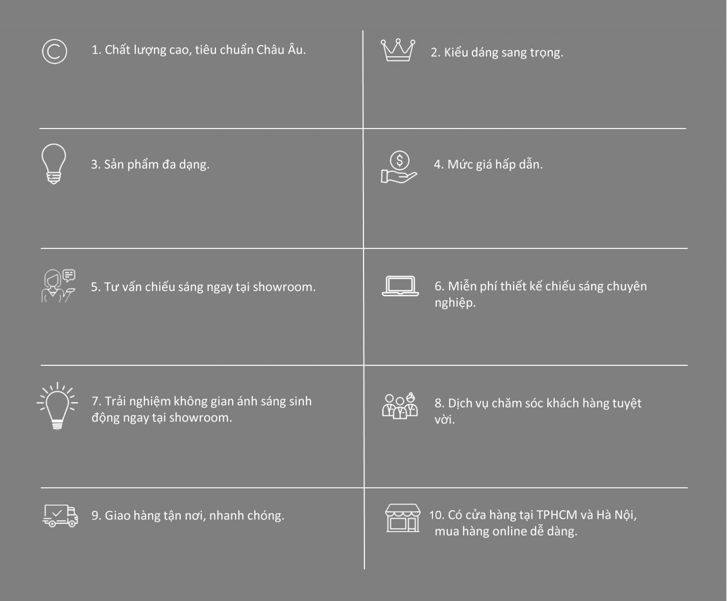 Chúng tôi quy tụ hơn 10.000 sản phẩm đèn chiếu sáng và trang trí của nhiều thương hiệu uy tín và nổi tiếng thế giới. Các sản phẩm và giải pháp chiếu sáng mới cũng được chúng tôi liên tục cập nhật. Hãy cho chúng tôi biết chúng tôi có thể giúp gì được cho bạn!