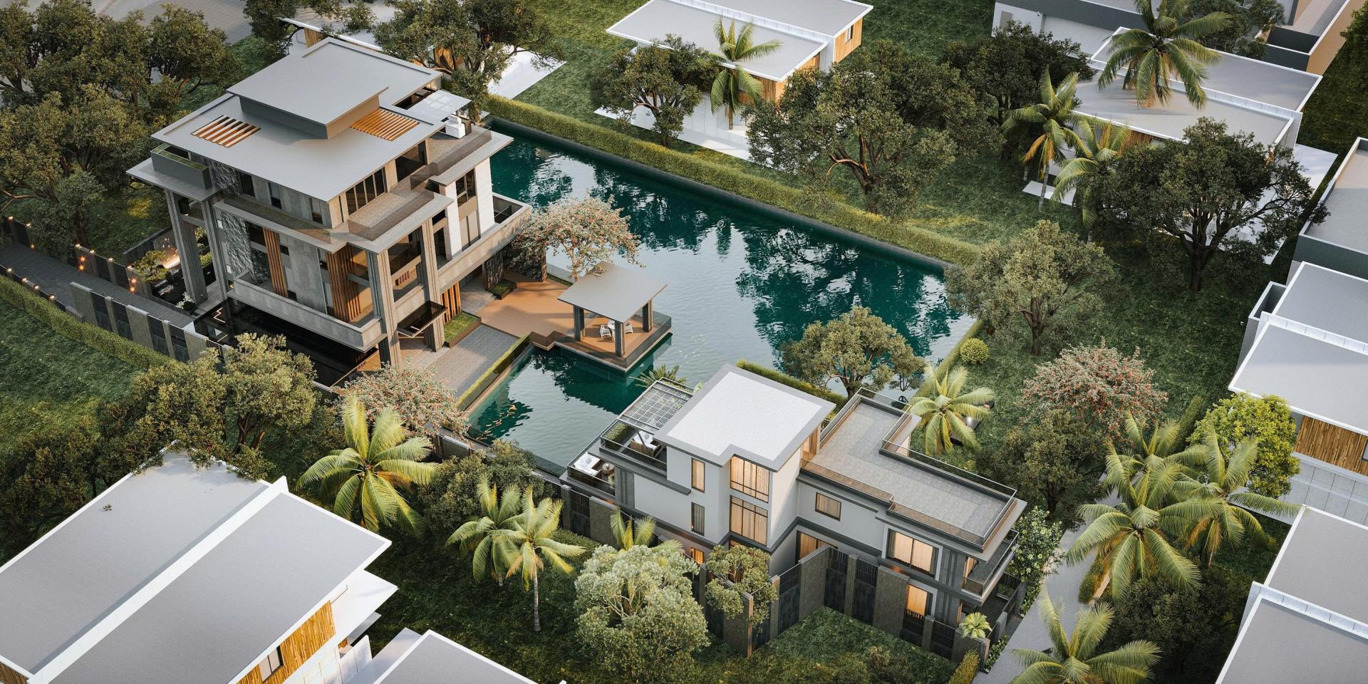 Biệt thự được tổ chức trong tổng thể kiến trúc – cảnh quan hài hòa với thiên nhiên, nơi khối nhà hiện đại mạnh mẽ được đặt giữa không gian sân vườn xanh mát và hồ nước uốn lượn như một dòng chảy mềm mại. Hồ cá đóng vai trò trung tâm cảnh quan, phản chiếu kiến trúc và cây xanh xung quanh, tạo nên cảm giác thư thái, tĩnh tại và giàu tính nghỉ dưỡng. Các lối dạo, chòi nghỉ và mảng cây nhiệt đới được bố trí có chủ đích, vừa đảm bảo sự riêng tư vừa mở ra những góc nhìn đẹp từ mọi không gian trong nhà.